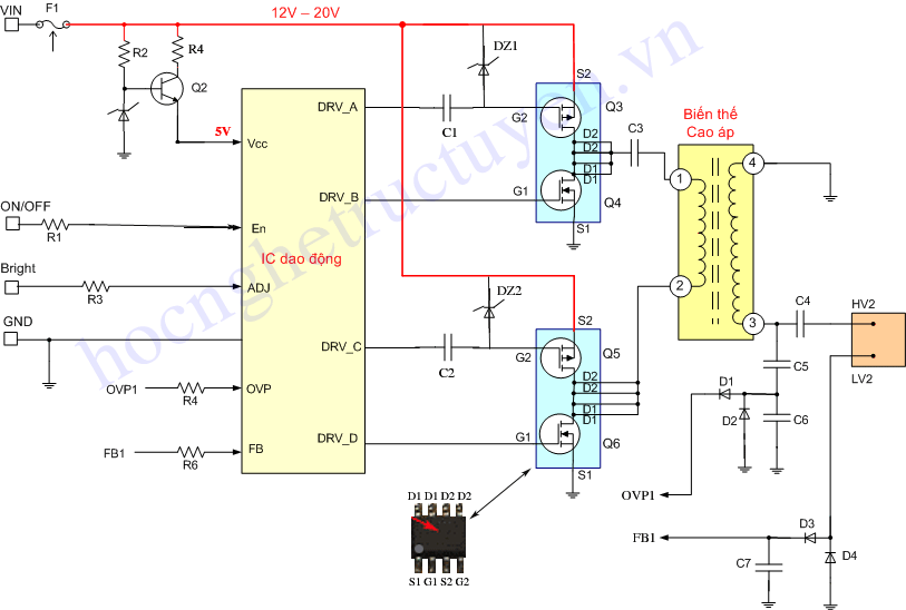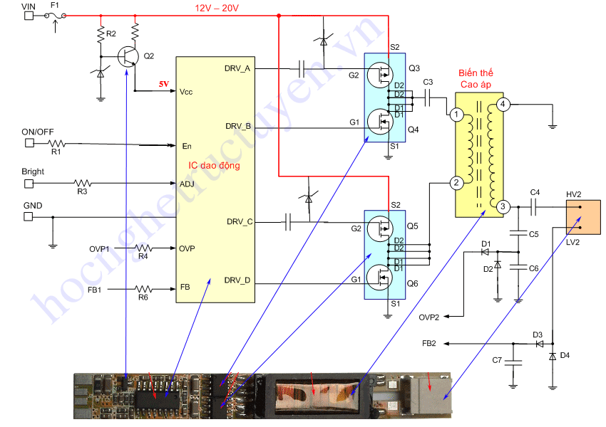 Mạch Inverter có nhiệm vụ cung cấp điện áp cho bóng cao áp để tạo ra