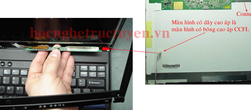 - Cắm bóng cao áp của đèn hình ngoài vào bo cao áp trên máy đang sửa rồi
